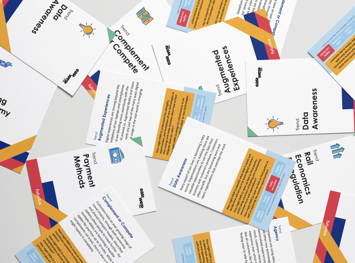 We delivered a set of reusable trend cards and a set of materials enabling further exploration into the future. The work provided a set of insights and recommendations on how EWR Co could take advantage of the opportunities highlighted and develop its digital strategy in a resilient and future proof way. These will be used over and over again as EWR Co continues on its journey to deliver a new rail experience.